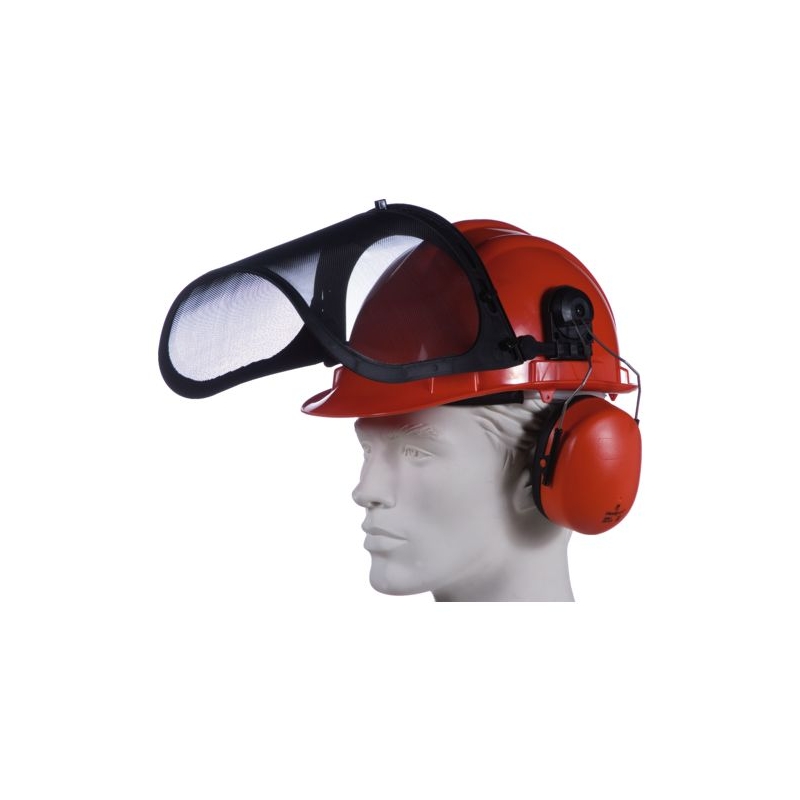 Protection de la tête forestier composée de : - casque Calotte en ABS, 4 points de fixation, coiffe textile, tour de tête en plastique équipé d'un serre-nuque à crémaillère permettant un réglage facile, mousse de confort à l'arrière, bandeau antitranspiration. Coloris : orange Norme : CE Cat II - EN 397 - coquilles antibruit adaptables par encliquetage (SNR 25,9 dB). Coloris : orange Norme : CE Cat III - EN 352-3 - porte-visière et visière grillagée. Norme : CE Cat II - EN 1731 Poids : 779 g