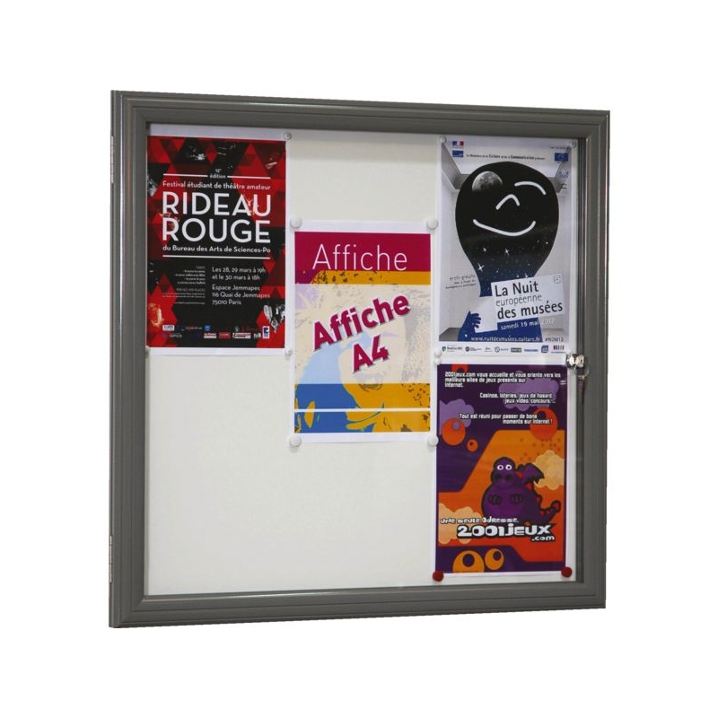 Vitrine réversible avec fond tôle laquée électrozinguée (affichage magnétique). Porte battante démontable avec charnière inox. Encadrement aluminium anodisé, façade verre Sécurit 4 mm. Fermeture par serrure dans le vitrage. Fixation murale 4 points. Épaisseur hors-tout : 35 mm Épaisseur utile : 21 mm Existe en noir, gris et rouge.